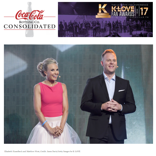The K-LOVE Fan Awards mission is to create a fan experience that celebrates and promotes artists, athletes, authors and entertainers who, with excellence, engage and impact popular culture for Jesus Christ. This year's show includes the return of co-hosts Elisabeth Hasselbeck and Matthew West. Coca-Cola Consolidated is the sponsor for The 2017 K-LOVE Fan Awards. For more information visit www.KLOVEFanAwards.com. The K-LOVE Fan Awards is a regional EMMY® (2016) winning John Sanders LLC/Eidon Event.