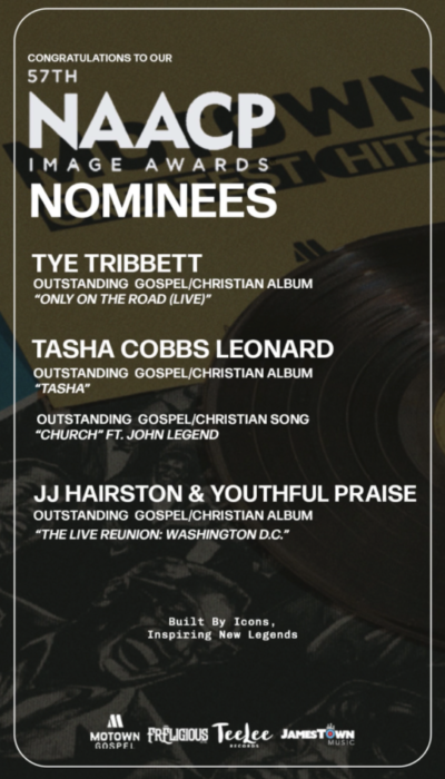 “These nominations underscore the importance of faith-driven music and its enduring influence across our culture,” says Walter Thomas, Senior Vice President, Motown Gospel. “Music has long played a vital role in the forward progress and ongoing pursuit of equality for our people. Having our artists recognized by the NAACP Image Awards during this pivotal time in our nation’s history is deeply meaningful. Motown Gospel remains committed to delivering music that uplifts and ministers to the soul during these challenging times.”